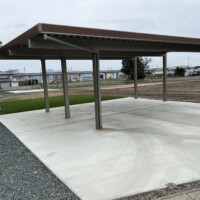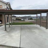 LIXILカーポート2台用+屋根延長タイプと土間コン工事、奥には人工芝リアリーターフを敷き、週末は家族でBBQを楽しんでいます。